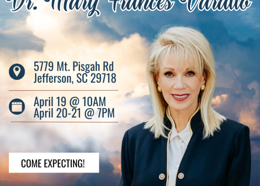 Join us on Sunday, April 19, at 10:00 AM, and again Monday through Tuesday, April 20–21, at 7:00 PM each evening, as Dr. Varallo ministers and shares what the Lord has placed on her heart. These special services are a wonderful opportunity to be refreshed in God’s presence and encounter the moving of the Holy Spirit.
