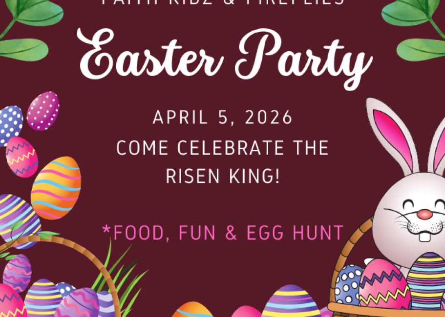 On April 5, the Faith Kids and Fireflies’ classes will have an Easter Party! There will be food, fun and an Easter Egg Hunt.